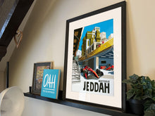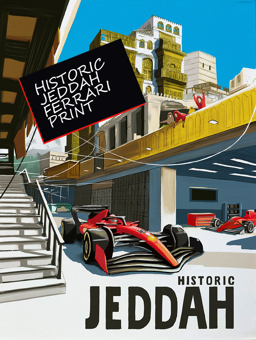 For the 2023 Saudi Arabian Grand Prix, I created a digital painting featuring Ferrari racers Charles Leclerc and Carlos Sainz, careening through the streets of Jeddah. Blending modern and traditional motifs, I aimed to capture the city's charm and character, with the classic car in the background adding a vintage flair. Printed on 200GSM Fine Art Paper, this museum-grade material highlights the art's different tones and highlights for a smooth finished look.